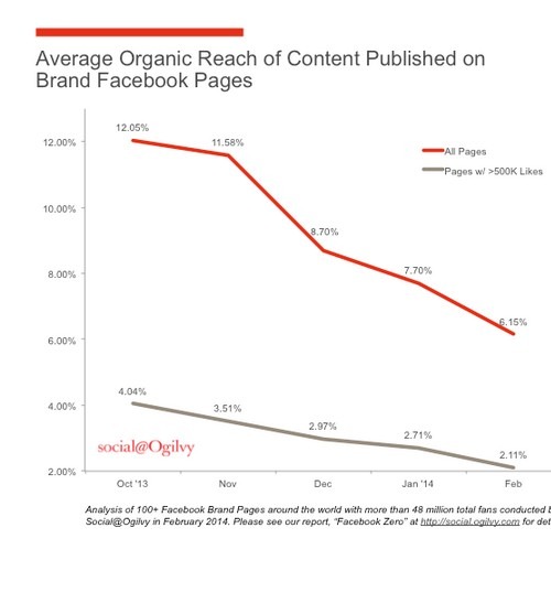 For instance, Facebook announced several months ago that it was once again changing the way pages would show up in people's timelines, and have been reducing the organic reach of posts significantly. Ogilvy and Mather posted a study on their social blog noting that in an "analysis of more than 100 brand pages, organic reach hovered at 6 percent, a decline of 49 percent from peak levels in October. For large pages with more than 500,000 Likes, organic reach hit 2 percent in February." What does this mean for brands that want to reach a larger audience? More than likely they're going to have to go for paid advertising on Facebook, building relevant and interesting content so that users want to engage with the brand.